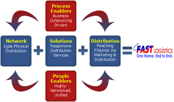 FAST LOGISTICS combines the Strength of an Agile Physical Distribution Network , the Edge of Responsive Distribution Services solutions , and the Reach of selling, trade marketing & distribution . All these aptly complemented and supported by proven, customer-tested Process and People ENABLERS.